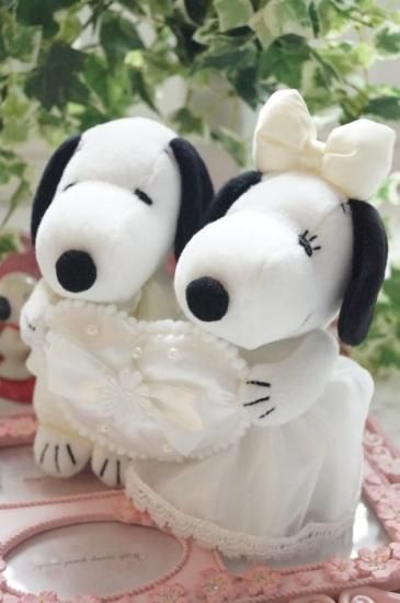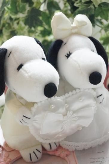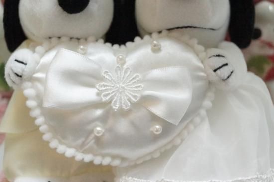 可愛いスヌーピー&ベルがハート型のリングクッションを持っています。