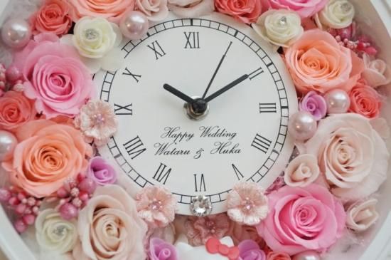 プリザーブドフラワーをふんだんに敷き詰めて、まるでケーキのような時計に仕上げました。