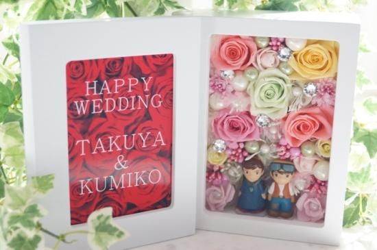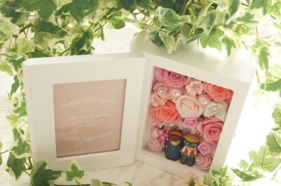 プリザーブドフラワーをふんだんに敷き詰めて、まるでケーキのようなフォトフレームに仕上げました。