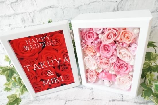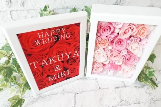 プリザーブドフラワーをふんだんに敷き詰めて、まるでケーキのようなフォトフレームに仕上げました。
